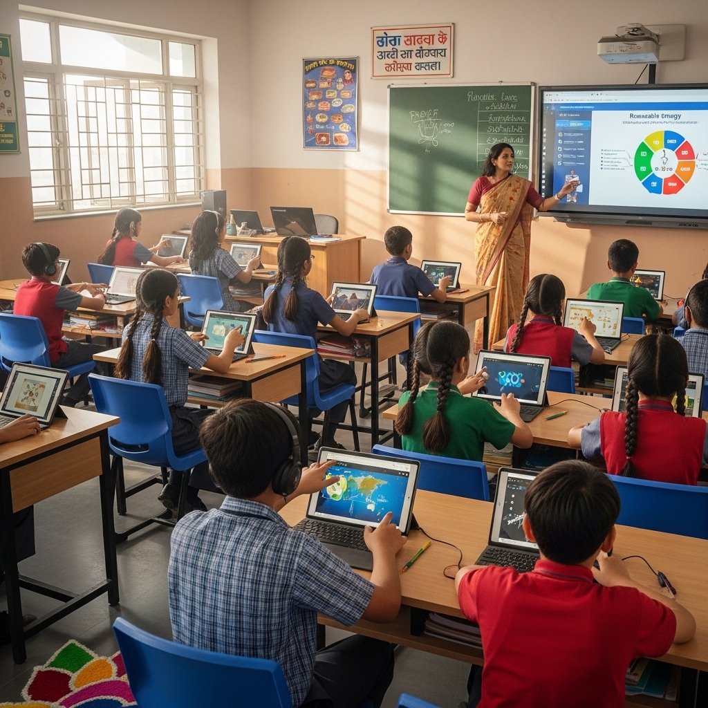 Digital learning integrates smart classrooms, interactive tools, and computer education to enhance understanding, creativity, and technological skills among students.